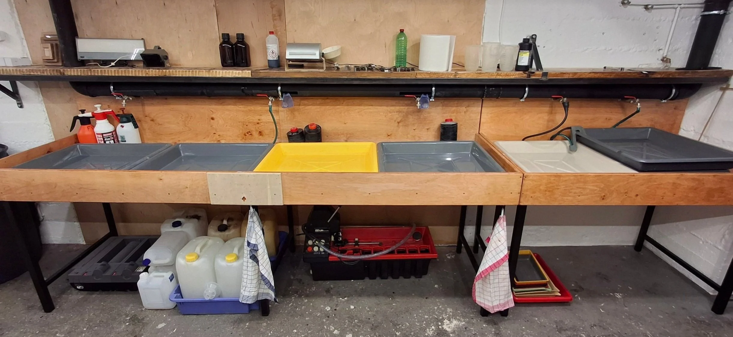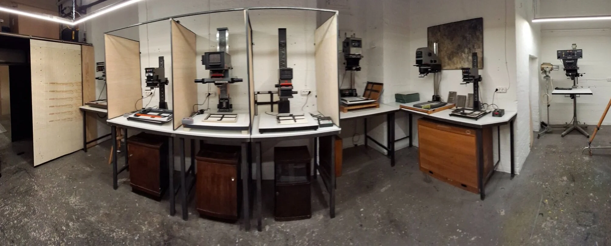 Az R6 Lab darkroomja egyedülállóan tágas, professzionális nagyításokhoz is alkalmas terében egyszerre heten tudtok önállóan saját nagyítóval dolgozni.